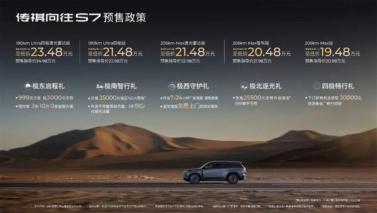 本次发布的传祺向往S7涵盖两大系列共五大车型版本,价格区间为20.98万至24.98万元,享受国家补贴后价格更是低至19.48万至23.48万元,消费者还可享受五重超级预售权益。