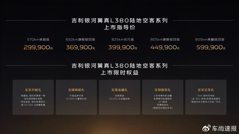 3月10日,吉利银河首款高端MPV——吉利银河翼真L380「陆地空客系列」在「东方好莱坞」横店影视城璀璨上市。新车共推出5个版型,官方指导价29.99万元-59.99万元,成为30万级最大最豪华的纯电MPV,开启“电混同价”新时代。发布会现场,「首席机长」张智霖亲临助阵,并当场下订805km典藏版四驱车型,成为「陆地空客」L380首位明星车主。
