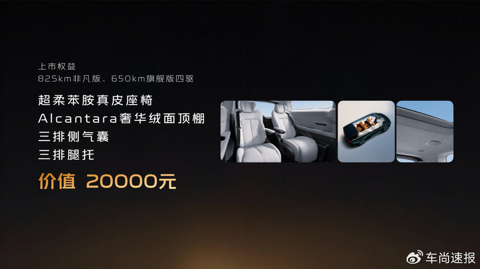 对于频繁往返沪杭、广深等地的商务人士来说,670km旗舰版四驱是不错的选择。豪华Nappa真皮和后排头枕屏,二排座椅带腿托、SPA按摩及一键躺倒功能,带遮阳帘的2.18㎡超大观景隔热天幕,商务接待面子十足。长途差旅或长途自驾爱好者,825km非凡版的超长续航是刚需。宁德时代140kWh麒麟电池,从杭州到北京仅需1次补能;CDC减震器+前后四空簧,大幅提升长途出行舒适性。这两个版型还限时加赠超柔苯胺真皮座椅、Alcantara、三排腿托、三排侧气囊等总价值20,000元的权益,进一步提升豪华舒适体验。