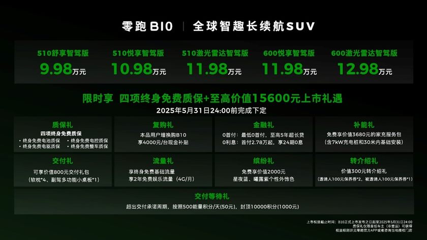 为回馈广大用户的支持与厚爱,零跑汽车为零跑B10购车用户提供9重好礼。即日起至5月31日24点,通过零跑官方渠道成功下定并最终提车的用户享有以下权益:
