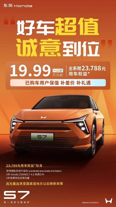 4月15日晚,东风本田官方渠道公布,本田首款纯电高端SUV东风本田S7正式推出“好车超值,诚意到位”的“一口价”:19.99万元-24.99万元,以及提供高达23,788元的用车权益,包含智驾辅助系统升级包、5年Honda CONNECT4.0免费OTA、5年免费车机无限流量。东风本田还将提供已购车用户保值政策:凡调价前购买东风本田S7的用户,后续将获得补差价和补礼遇。