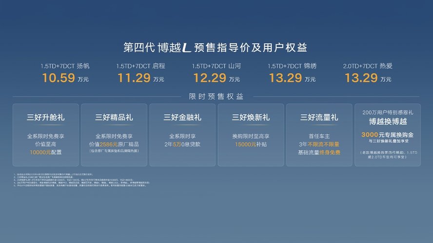 2025年4月22日,第四代博越L正式开启预售,新车共推出扬帆版、启程版、山河版、锦绣版、热爱版5个版型,预售指导价10.59-13.29万元。作为博越家族的新一代SUV,第四代博越L在设计、智能化、驾控性能以及空间布局等方面实现了全面升级,力图在同级市场中树立新的标杆。