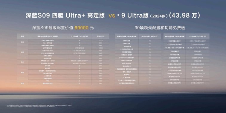 4月23日,定位“家庭大六座智慧旗舰SUV”的深蓝S09在上海车展正式发布价格权益,共推出5款配置:后驱Max、后驱Ultra、后驱Ultra+、四驱Ultra、四驱Ultra+高定版,预售价格区间为23.99万元-30.99万元。首批用户专享7项权益,价值超83359元。众所周知,在大六座市场中,很多用户钟情于理想L9以及问界M9类型的大六座SUV,想必让这批拥趸在接受一个新车,需要品牌展现更多魅力来吸引他们。对此,深蓝汽车霸气喊话:“分手费“,深蓝S09替你出!对于那些钟爱“9系”的铁粉来说,这份补贴还真容易让人“移情别恋”。