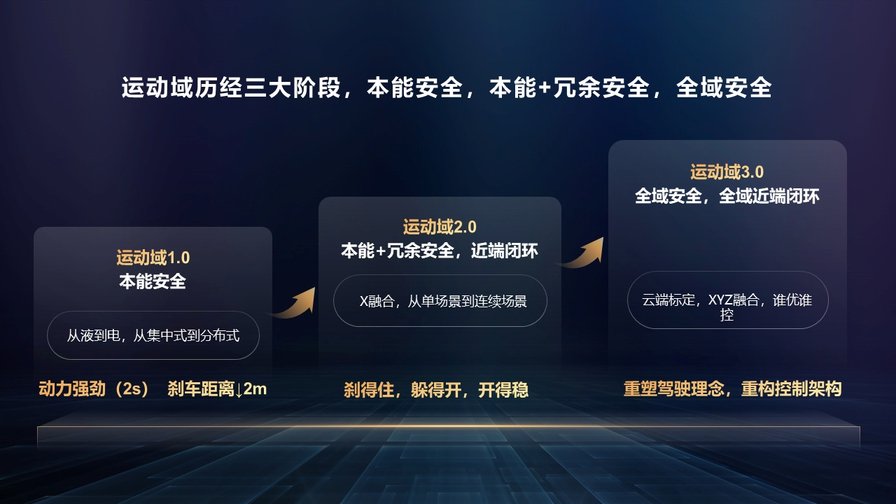 关于这点,华为数字能源智能电动产品线总裁王超在发布会总结到:“运动域的发展历程可分为三个阶段,分别是本能安全、本能+冗余安全和全域安全。其中1.0阶段,会面临从液压控制到全面电动化,从集中式演进到分布式控制阶段;进入到2.0阶段,部件之间的冗余备份会显著提高汽车的行驶安全,近端闭环也会降低部件响应时间,汽车操控更丝滑。未来,面向3.0阶段,将实现全域安全、全域近端闭环,通过XYZ深度融合颠覆传统驾驶思维。”