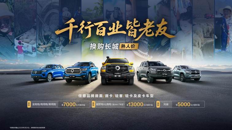 千行百业皆老友,长城给你熟人价。即日起至5月31日,任意品牌微面/微卡/轻客/轻卡及皮卡车型置换长城皮卡,可享5000元至13000元大额补贴。其中,置换风骏享5000元大额补贴,置换金刚炮/商用炮/乘用炮享7000元大额补贴,置换越野炮/山海炮(除山海炮Hi4-T车型)享13000元大额补贴。