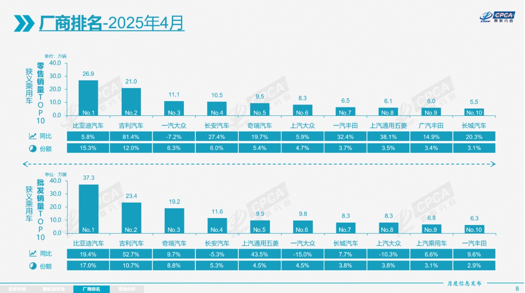 长安汽车冲上来了,排名第四位,4月零售销量达到10.5万辆,同比增长27.4%,现在,长安汽车新能源产品增速提升明显,这是它整体销量快速增长的主要原因。