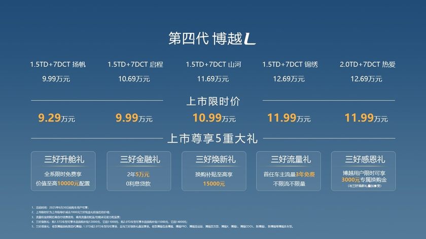 第四代博越L共推出扬帆版、启程版、山河版、锦绣版、热爱版5个版型,现金补贴后上市限时价9.29-11.99万元(2025年6月30日前购车的用户,可享上市限时价)。同时,即日起至2025年6月30日购买第四代博越L,还可享受以下上市权益,让用户购车更轻松,用车更省心。