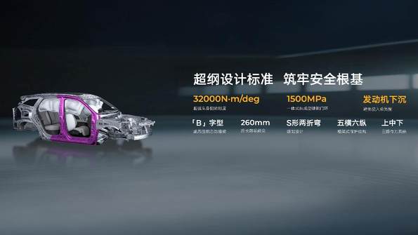 第四代博越L采用笼式车身结构,拥有同级最大的32000N·m/deg车身扭转刚度。五横六纵的框架结构,进一步强化车身与底盘的融合,加上三足鼎立传力系统、S形两折弯纵梁设计、发动机下沉技术、高强度前防撞梁、高强度后防撞梁和1500MPa一体式热成型硼钢门环等,以8大被动安全构筑移动安全堡垒,时刻最大限度保障用户安全。