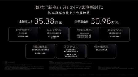 魏牌高山推出高山7、高山8和高山9三款配置,其中高山9指导价35.38万元;高山8指导价30.98万元,价格明显低于坊间预测,高山7暂时没有公布价格。