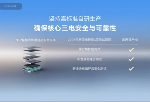 此外,针对用户最关注的三电, 东风日产坚持高标准自主研发生产,最大程度确保安全性与可靠性。根据2026年的新国标,N7搭载的超安全电池不仅24项标准测试全部达标,更提前满足了热扩散、底部撞击、快充循环后安全测试3项新增标准。