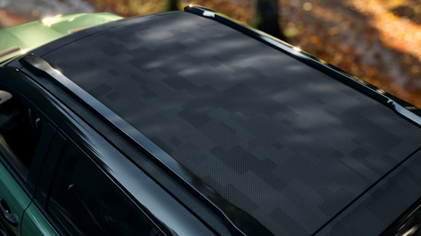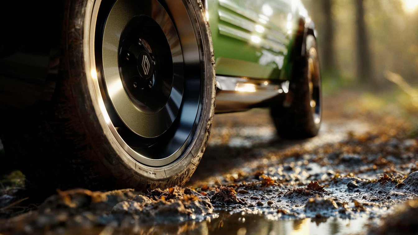 雷诺4 Savane车身采用翡翠绿车漆,搭配跨界越野风格有一种放荡不羁的感觉。车顶采用像素图案设计并配有行李架,尾灯采用长椭圆设计,有一点MINI的感觉。同时我们还能看到“4X4”的标识,但它没有传统物理传统轴而是前后双电机电四驱。相比较普通版雷诺4,它的最小离地间隙再提升15mm,搭配18英寸复古饼样式轮毂,轮胎选用的是固特异UltraGrip Performance+系列,尺寸为225/55。