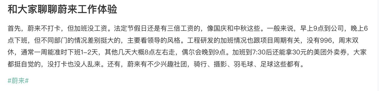 (蔚来当然也有过员工加班出现健康状况的新闻,也没人会天真地以为它们绝对干净,本文所说的是横向对比下的相对而言。)