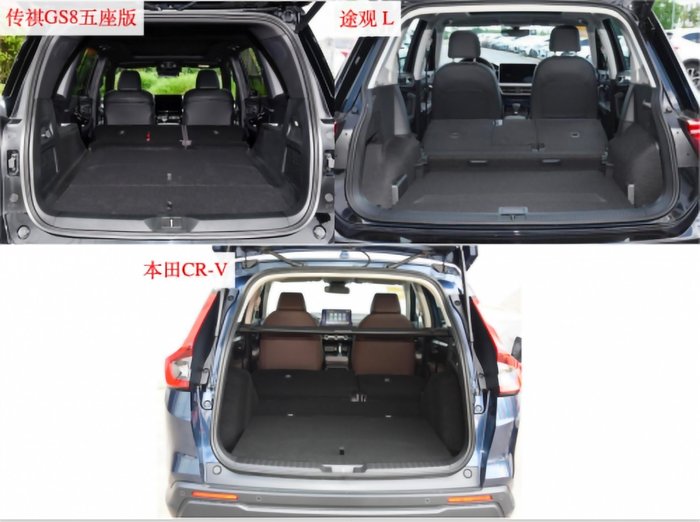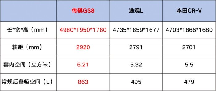 在SUV领域,空间是检验实用性的“硬指标”。传祺GS8以4980mm车长+2920mm轴距的跨级尺寸,直接对标豪华中大型SUV,套内空间达6.21立方米,五座版后排腿部空间轻松超过两拳,七座版第三排也能满足短途应急需求,真正实现“灵活大空间”。反观合资阵营,CR-V轴距仅2701mm,途观L轴距2791mm,后排腿部空间比GS8短10cm以上,地台凸起问题更让中间乘客苦不堪言。