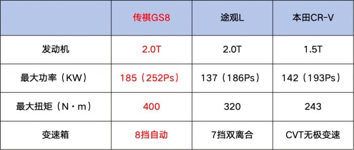 变速箱匹配上,GS8匹配的爱信8AT换挡平顺,响应迅速,以行业领先的换挡速度打破了“大车笨重”的刻板印象;而CR-V的CVT变速箱存在“冷保护”问题,冬季起步迟缓;途观L的双离合变速箱低速顿挫明显,体验都差强人意。