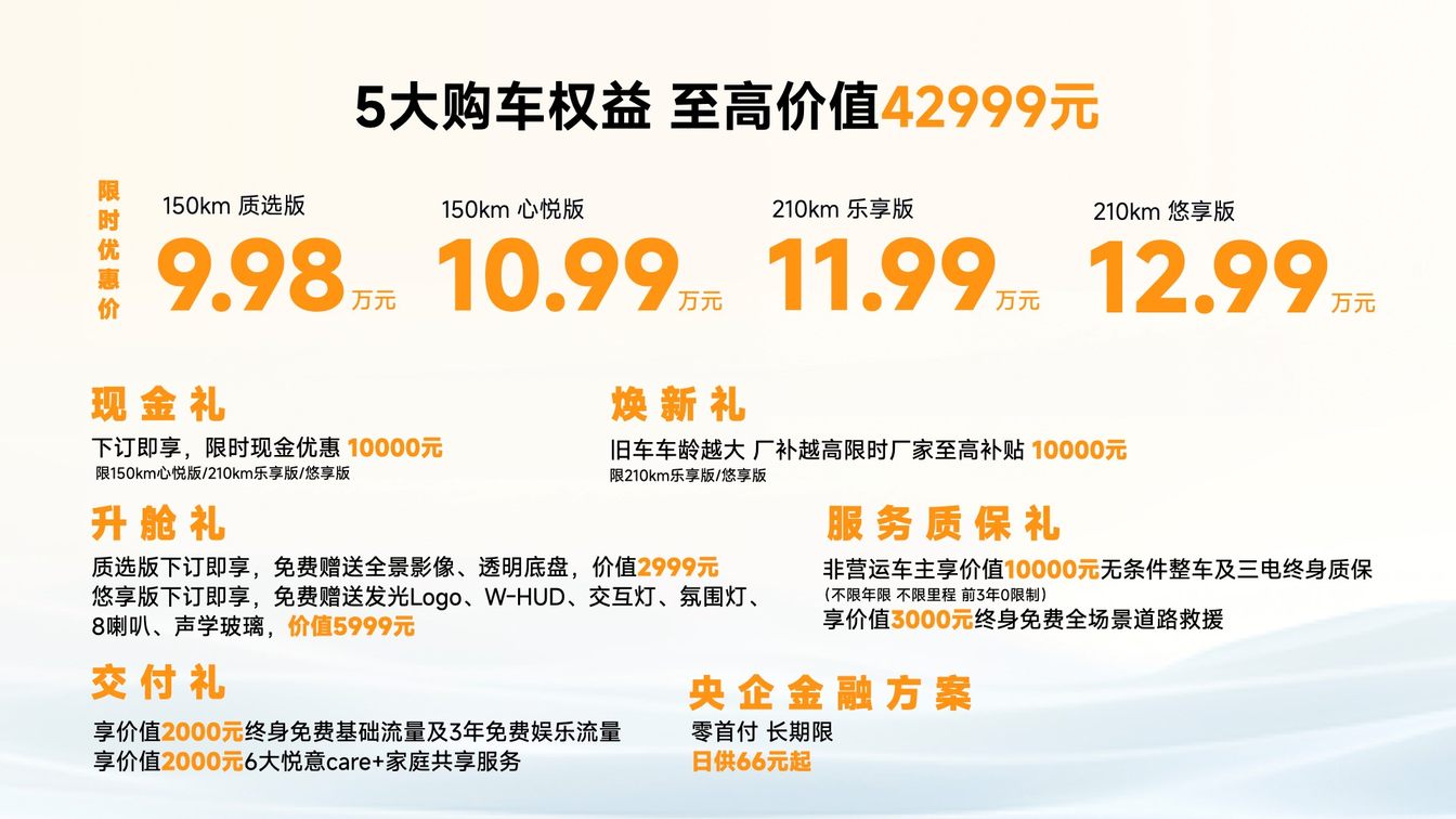 价格降维:9.98万元起售价直接切入传统燃油车腹地,较同级别竞品低2-3万元。叠加置换补贴与终身质保,实际购车成本逼近A级燃油SUV。