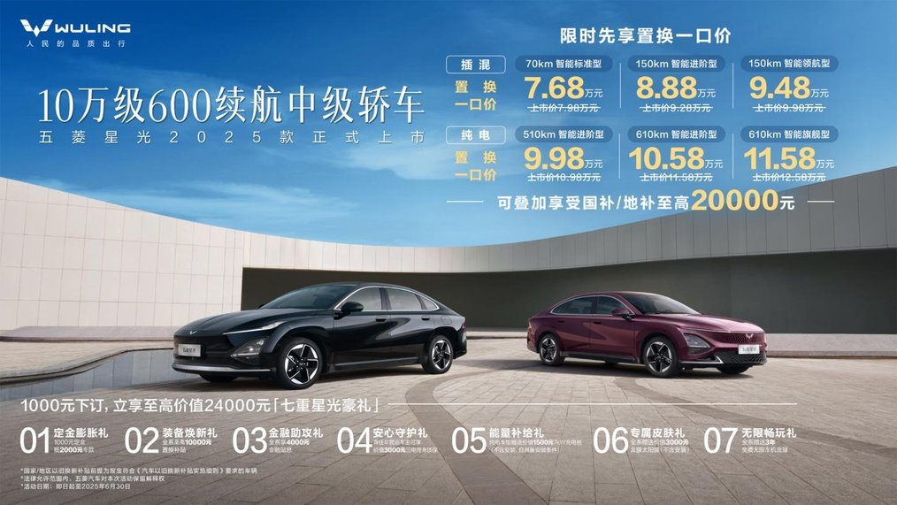 【2025年5月28日】今日,五菱汽车宣布10万级600续航中级轿车——五菱星光2025款正式上市。新车提供纯电、插混两种动力形式,共推出插混70km智能标准型、插混150km智能进阶型、插混150km智能领航型、纯电510km智能进阶型、纯电610km智能进阶型、纯电610km智能旗舰型六款配置,上市指导价为7.98-12.58万元。五菱星光2025款在续航、安全、舒适、智能、颜值上进行了全方位升级,为了让消费者更好地体验到至高43000元的进阶价值,五菱推出购车限时先享置换一口价7.68-11.58万元,其中纯电610km续航车型仅需10.58万元起,此外还可以叠加国补/地补至高20000元。上市即日起至2025年6月30日,在五菱汽车官方渠道以1000元下订,还可享至高价值24000元的「七重星光豪礼」,包括定金膨胀礼:1000元定金抵2000元车款;装备焕新礼:全系至高10000元置换补贴;金融助攻礼:全系享4000元金融贴息;安心守护礼:首任非营运车主享价值3000元三电终身质保;能量补给礼:纯电车型赠送价值1500元7kW充电桩(不含安装,且具备安装条件);专属皮肤礼:全系赠送价值3000元龙膜太阳膜(不含安装);无限畅玩礼:全系赠送3年免费无限车机流量。
