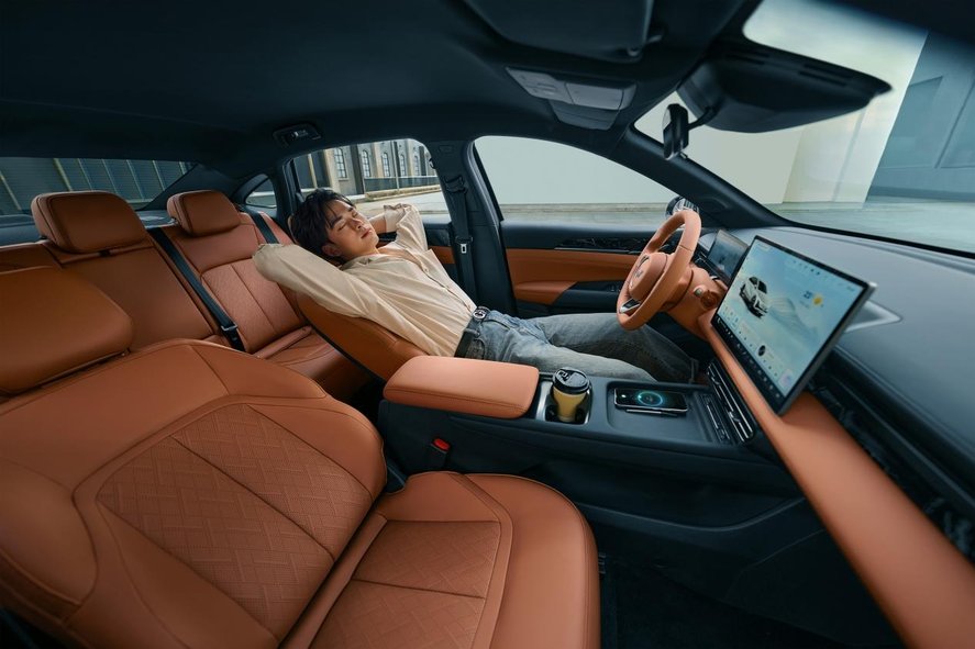 坐进车内,其内饰采用全新肤感面料包覆,主要接触区全软包覆,霞光橙与暗夜灰两种配色兼顾运动感与高级感。环抱舒压电动座椅可提供良好的支撑性和包裹性,前排电动座椅具备通风加热功能,冬暖夏凉,让用户彻底告别开车腰酸背痛难题。中岛区域配备50W大功率无线快充,方便随时为手机等设备充电;舒适怀挡的配置,让换挡更轻松优雅;600L超大后备箱与26处储物空间亦可满足不同物品的收纳需求。座舱的丰富配置与巧思细节,让用户切实拥有 “B 级车的驾乘享受”。