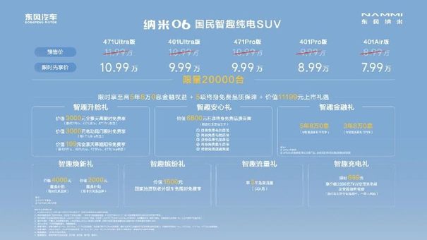 大可玩,尽情6。5月27日,东风纳米旗下“国民智趣纯电SUV”东风纳米06在武汉正式上市,限时先享价为7.99万元-10.99万元。作为一个听劝的品牌,东风纳米06为用户带来7大诚意权益,包括电动尾门和全景天幕限时送、五项终身免费品质保障、中国国家地理联名外观车色限时免费享、最高4000元置换补贴、至高享“5年8万0息”、送3年免费流量、699元享价值2699元充电桩及安装服务等众多的超有诚意权益。当产品超过期待、价格超出期待、品质越级领先,是给予用户最大的诚意,也是东风纳米赋能国民极致美好生活的最大底气。