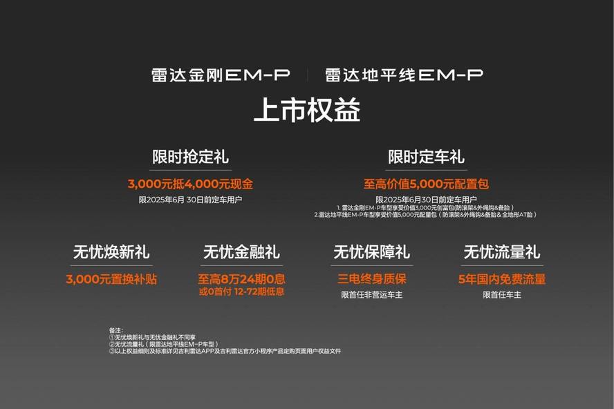 5 月 28 日,吉利雷达同时发布了两款重磅电混皮卡——全球家用超级电混皮卡雷达地平线EM-P和全球家商两用超级电混皮卡雷达金刚EM-P。其中地平线EM-P智能版四驱价格15.98万,地平线EM-P全能版四驱价格14.98万,金刚EM-P千里金刚四驱定价13.98万。两款电混皮卡均基于正向开发的原生M.A.P雷达瀚海新能源皮卡平台打造,并依托全球领先的高效智能动力科技——雷神EM-P超级电混系统,具有超强动力、超维安全、超级好开、超能省钱、超享智能等优势,为跨城之间长途出行、北方高寒以及补能设施不完善的地区用户提供外解决方案。