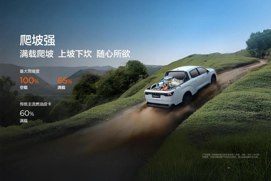 额定载重0.5吨,耐久承载能力1.3吨,抛弃了传统皮卡大梁脱离车身的设计结构,采用了与特斯拉Cybertruck相同的隐藏式大梁设计技术,让车身更结实,比传统分体式非承载车身更耐用、载重上限更高,重载也不翘头。且凭借强大的扭矩输出,即使在山区高原等复杂路况下,也能实现空载100% 最大爬坡度、重载0.5吨 65%的最大爬坡能力,而传统皮卡满载爬坡只有60%。同时,智能电四驱技术配置3种驾驶模式、4种地形模式,让用户在面对泥泞湿滑路、碎石路等极端情况时,能够轻松脱困。