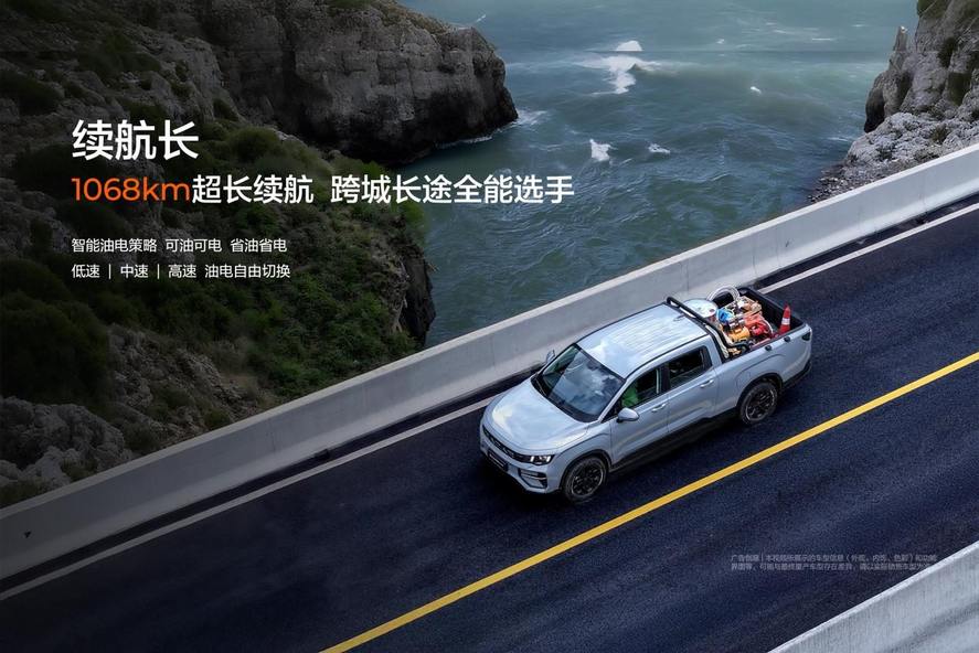吉利雷达新能源皮卡全方位保持乘用化标准,超级电混皮卡“用起来是皮卡,开起来是SUV”。两款车续航均达到了1068km,在目前上市的新能源皮卡中,续航最长。这得益于行业首发的3DHT架构,比燃油皮卡油耗低了30%,长途不虚高速不软。
