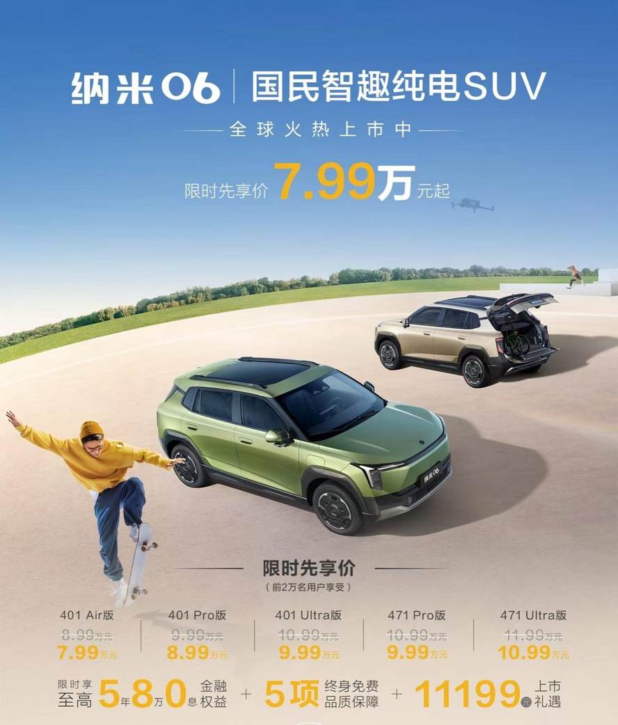 作为东风汽车发布“天元智能”品牌技术后的首款量产国民纯电车型,纳米06于5月27日正式上市,本次登录粤港澳大湾区车展除了带来7.99万元-10.99万元的先享诚意价外,同时还给到了用户包括电动尾门和全景天幕限时送、五项终身免费品质保障、中国国家地理联名外观车色限时免费享、最高4000元置换补贴等众多的超有诚意权益,主打一个听劝。