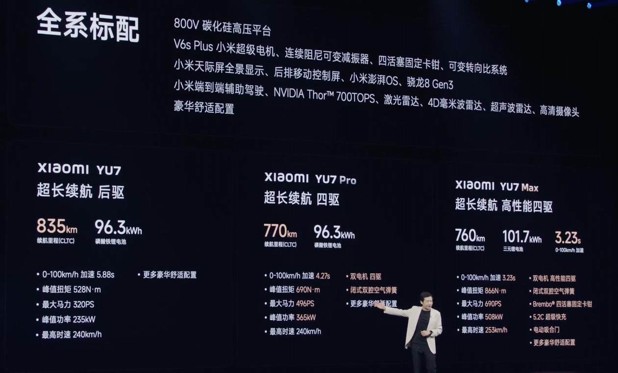 最后是纯电续航,小米YU7标准版车型就配备了96.3度的动力电池,纯电续航里程为835公里。而小米SU7标准版车型电池包容量为73.6度,纯电续航也只有700公里。同时小米YU7还支持800V高压快充,小米SU7只有顶配车型才有800V高压快充,其他两个配置只有400V高压快充。