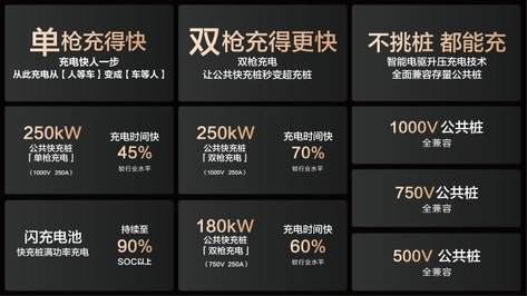 兆瓦闪充技术的突破性在于“全场景适配”。首创“智能升压”技术,搭载车辆可全面兼容现有公共快充桩,让用户充电不挑桩、桩桩都能充;在常见的单枪充电模式下,单枪充电时间较行业水平快45%,充电速度大幅提升;独创“双枪充电”技术,实现充电功率接近翻倍,让公共桩秒变超充桩,充电时间较行业水平快70%。