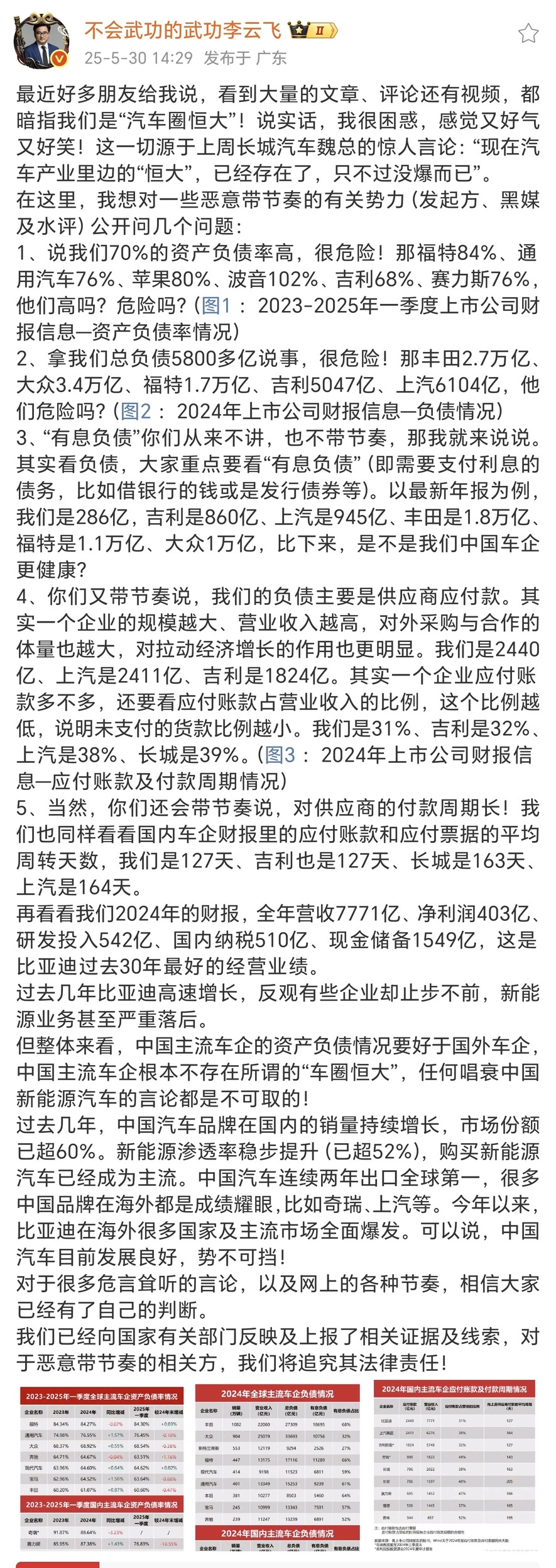 中国汽车走到今天何其不易!“车圈恒大”的恶意言论实在荒谬。比亚迪李云飞总用数据有力回击,资产负债率、总负债等多项指标,比亚迪都表现稳健,且优于不少外企。如今中国汽车发展迅猛,国内销量攀升、出口第一,岂容恶意抹黑?支持比亚迪积极维权!
