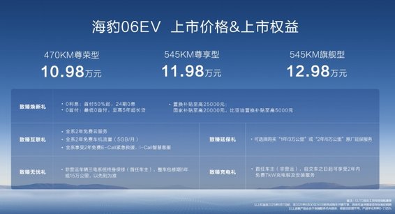 6月7日,比亚迪海洋网潮美质选轿跑海豹06EV于重庆车展上市。新车共推出3款配置,售价10.98-12.98万元,并推出多重购车礼遇。