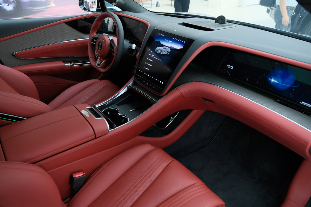 仰望U7的“时空之门”设计语言,从三星堆青铜面具中汲取灵感,前脸C形像素大灯如古文明图腾般深邃,溜背轿跑车身以0.195Cd超低风阻系数切割气流,将东方神韵与电动美学熔铸一体。步入“星环座舱”,云锦红双色Nappa真皮包裹的行政座椅支持20向调节与热石按摩,23个丹拿扬声器环绕中,旋转升降的高音单元如日晷般缓缓升起,仪式感与奢华感瞬间拉满。