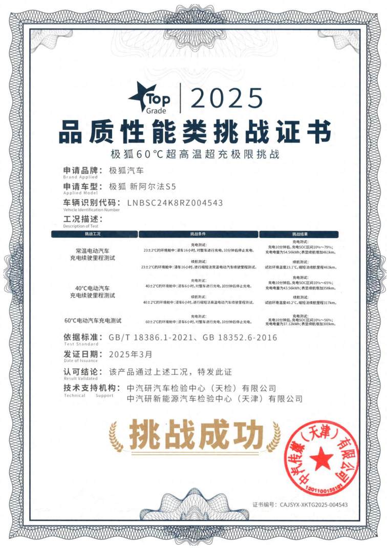 炎热夏日即将来到,车辆也将迎来高温挑战,就在前不久,极狐 新阿尔法S5迎来了一场极端的高温“烤”验,新阿尔法S5凭借卓越性能,通过“极狐60℃超高温超极限挑战”,荣获由权威机构认证的《2025品质性能类挑战证书》。测试中,新阿尔法S5在60℃超高温工况下,成功通过充电性能、电系统稳定性等多维度考核。