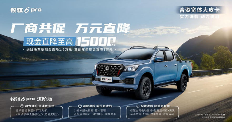凭借“三大进阶”的产品优势以及“四同”品质的有力背书,再加上现金直降15000元的超值优惠,郑州日产锐骐6 pro进阶版堪称“皮卡界全能战士”。限时福利抢到即赚到!喜欢的车友速速预约试驾,一键开启实力满载的夏天。