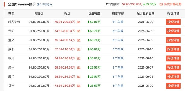 目前2025款卡宴现在最高可以优惠35%,例如选配完是115万元,75万元就可以提车(不含购置税和保险),相当于6.5折。2025款帕拉梅拉,选配完价格在125万左右,再加上购置税、保险等,优惠后便宜了30多万元。