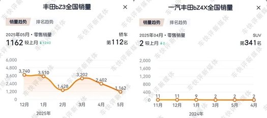 综上所述,相比竞品车型丰田bZ5除了售价比较便宜,三电系统也是比较明显的一个优势。劣势是在新能源车市场,一汽丰田品牌的认知度比较低。关于这一点,看看上图一汽丰田bZ3和bZ4X的销量就能说明问题。bZ3连续两个月销量下降,月销量创下了今年的新低。bZ4X没有查到5月的销量数据,大概率是一辆车都没有卖出去。