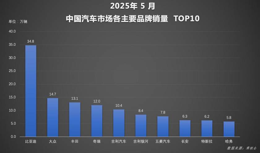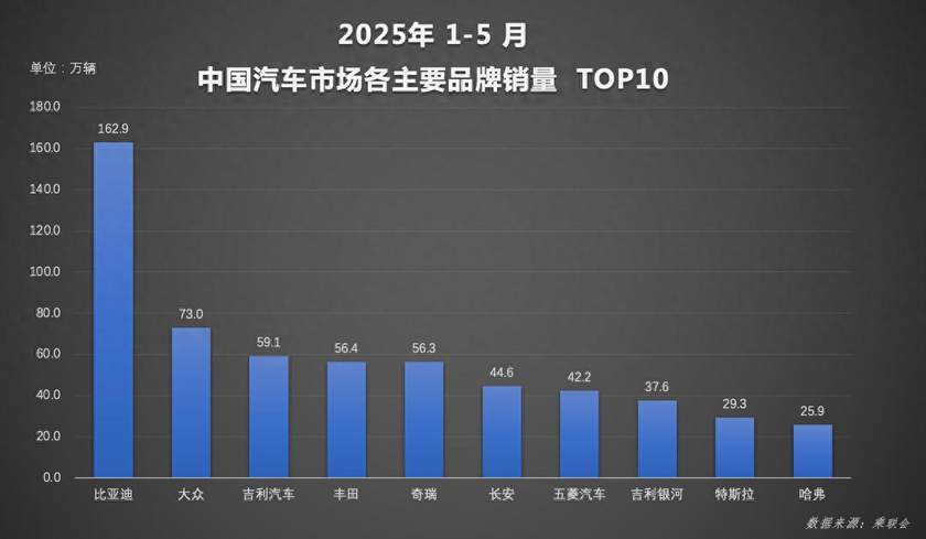伴随新能源汽车渗透率持续提升,比亚迪再次以强势表现巩固行业领军地位。2025年1-5月,比亚迪汽车累计销量达162.9万辆,不仅稳居国内市场品牌销量榜首,更在海外市场实现了突破性增长,展现出强劲的发展势能。