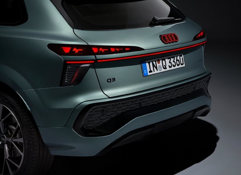 车身侧面线条流畅而富有力量感,贯穿式肩线与quattro家族特征的轮拱过渡自然,D柱后倾设计优化了整车比例,使车身更显修长动感。尾部设计同样出彩,采用时下流行的贯穿式LED灯带,上部为发光品牌LOGO,并可选装数字OLED尾灯技术,这也是该技术首次应用于Q3车型。