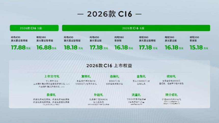 从“价格战”到“价值战”,2026款零跑C16的上市标志着中国新能源市场进入新竞争阶段。通过冠军6座与全新5座的双线布局,零跑不仅实现了对家庭用户需求的精准覆盖,更以“三大价值进阶”与“十项同级唯一标配”的技术实力,再次践行“科技普惠”使命。对于追求品质与实用性的消费者而言,零跑C16无疑是一个不可多得的选择。