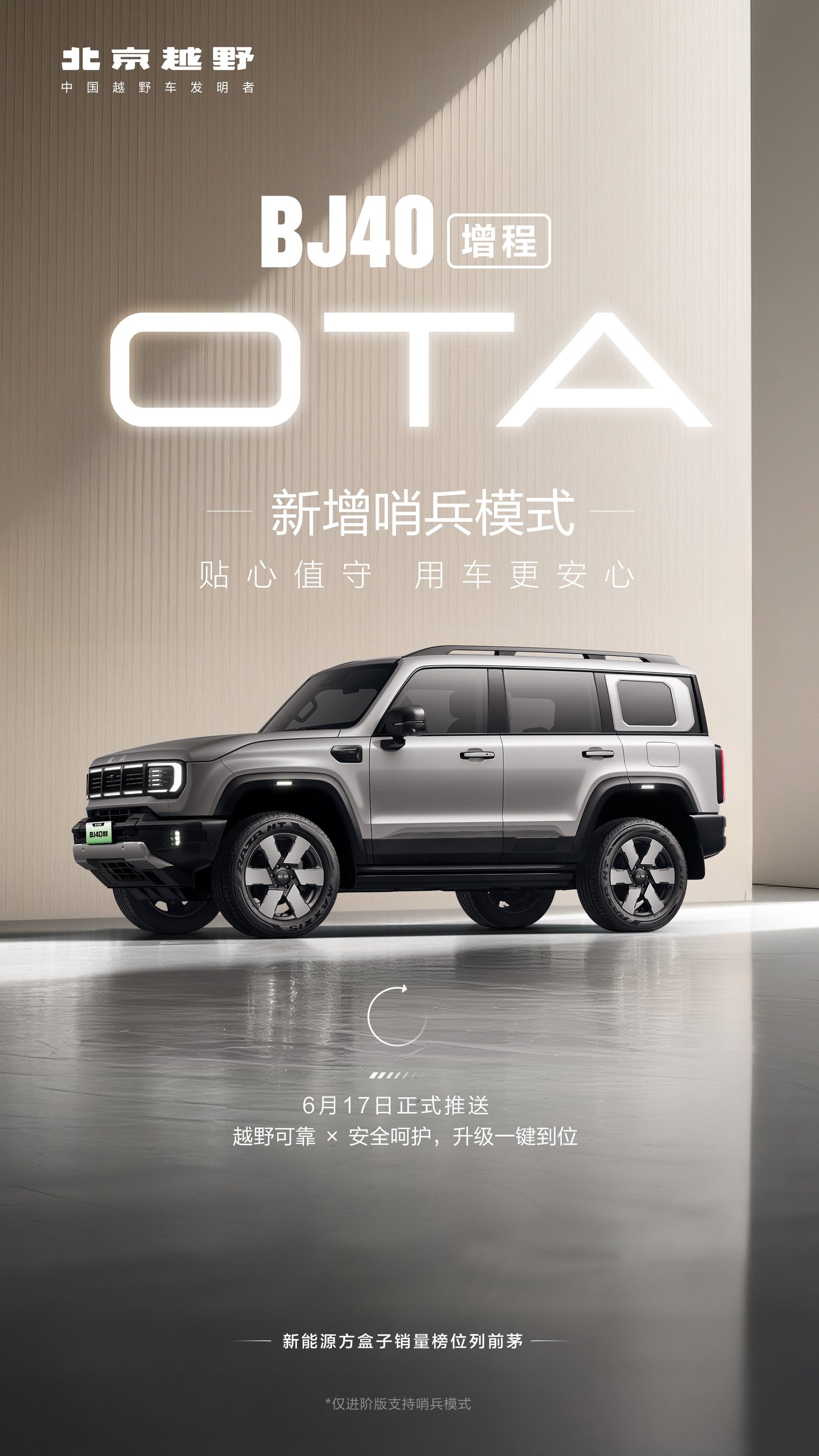 从硬核越野性能优化到日常用车体验打磨,从便捷升级路径到完善售后保障,此次OTA升级不仅是北京越野技术实力的展现,更是“以用户为中心”品牌理念的落地。BJ40 增程凭借持续迭代的智能体验,将进一步巩固其在新能源越野市场的标杆地位,让用户在城市通勤与户外撒野间,都能享受到更智能、更可靠的美好户外生活。