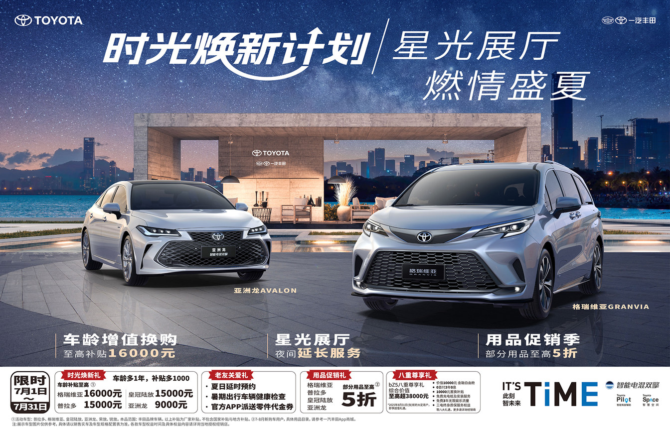 22年间,销售公司始终以最具诚意的营销措施回馈用户厚爱,比如上半年推出的“时光焕新计划”,就是立足用户购车和用车的全周期,以车龄增加一年补贴增加1000元的“车龄增值补贴”机制,彻底消除用户的时间担忧和里程焦虑。7月1日—7月31日,一汽丰田真诚加码,车龄增值换购,至高补贴16000元;星光展厅夜间延长服务,避开酷暑轻松看车,购车更从容;格瑞维亚、普拉多、皇冠陆放、亚洲龙部分用品至高5折;购买bZ5还可享价值10000元的金融自由舱、0首付3年0息、置换补贴10000元、免费充电桩及安装服务等八重尊享礼,综合价值至高超38000元;更有丰厚的老友关爱礼,让盛夏驾享更省心。