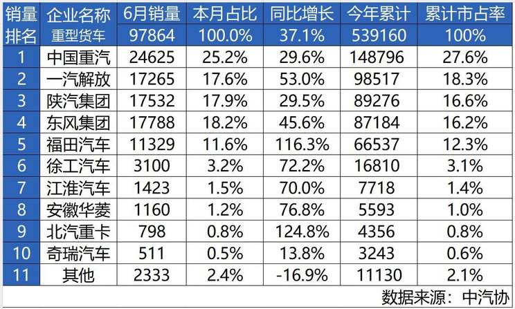 近日,中国重汽发布5月重卡销量数据。数据显示,2025年上半年,我国重卡市场销售共计约539160辆,较上年同期增长6.9%,其中中国重汽销售重卡148796辆,市场占有率高达27.6%,再次蝉联销量、市占率“双料冠军”。另外,2025年6月,中国重汽单月销量24625辆,同比增长29.6%,连续五个月实现重卡销量同比增长。