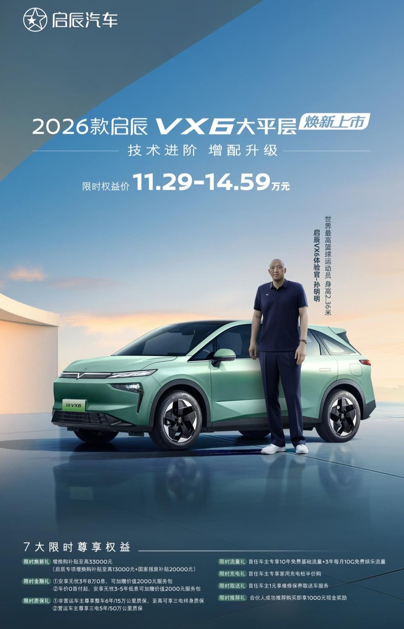 7月15日,启辰汽车正式发布2026款启辰VX6大平层,定位“智能百变大纯电SUV”。新车延续标志性超大空间优势,特别邀请身高2.36米的著名篮球运动员孙明明先生出任产品体验官,以亲身经历诠释产品实力。此次焕新,核心聚焦电池安全与补能效率的突破性升级,并新增多项便利配置,为追求品质生活的家庭用户带来更高价值的选择。