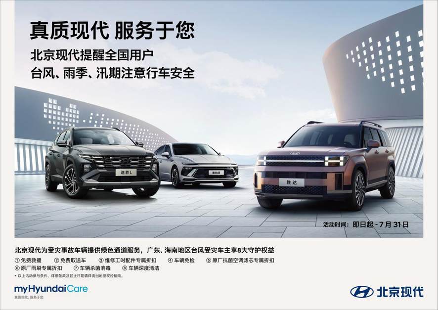 此外,北京现代提醒全国用户,在台风、雨季、汛期期间要注意行车安全。同时,在保障自身安全的情况下,对临近需要帮助的车主朋友提供支援,希望大家在困难面前团结互助,共克时艰。