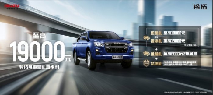 A:每款车型的优惠力度不一样,需要根据您选的具体车型,以及是否有旧车置换,是否需要贷款等综合来计算,这是一个浮动范围,以购买单车型可享受的最大优惠来看,铃拓至高优惠19000元,D-MAX至高优惠18700元,瑞迈至高优惠14000元。