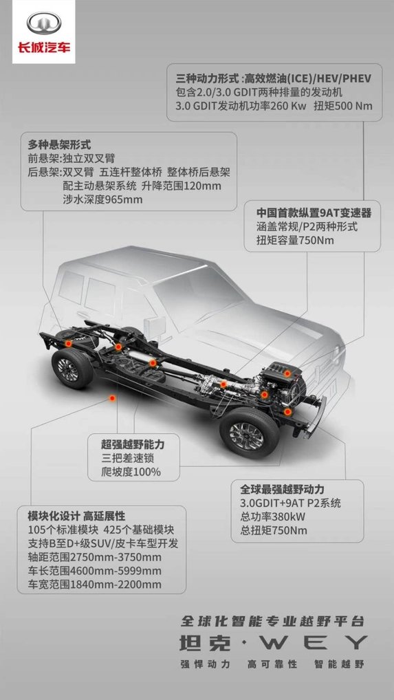 坦克300将会基于越野平台打造,采用非承载式式车身,搭载3.0t发动机加9at变速箱,最大功率380千瓦,总扭距可以达到750牛米,带有三把差速锁,同时前悬架采用独立双叉臂,后悬架也同样采用双叉臂,5连杆整体桥结构,这台基于联盟平台打造的车型可以兼容燃油插电混动以及纯电动三种不同的动力模式。