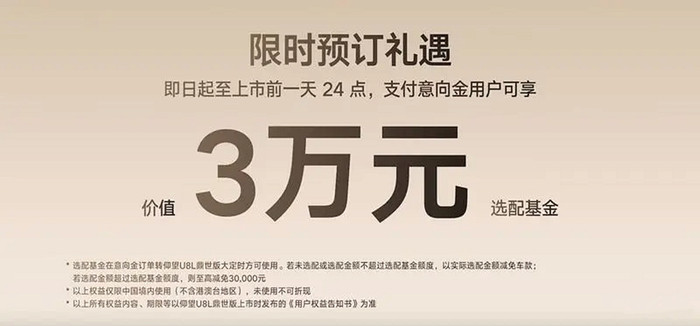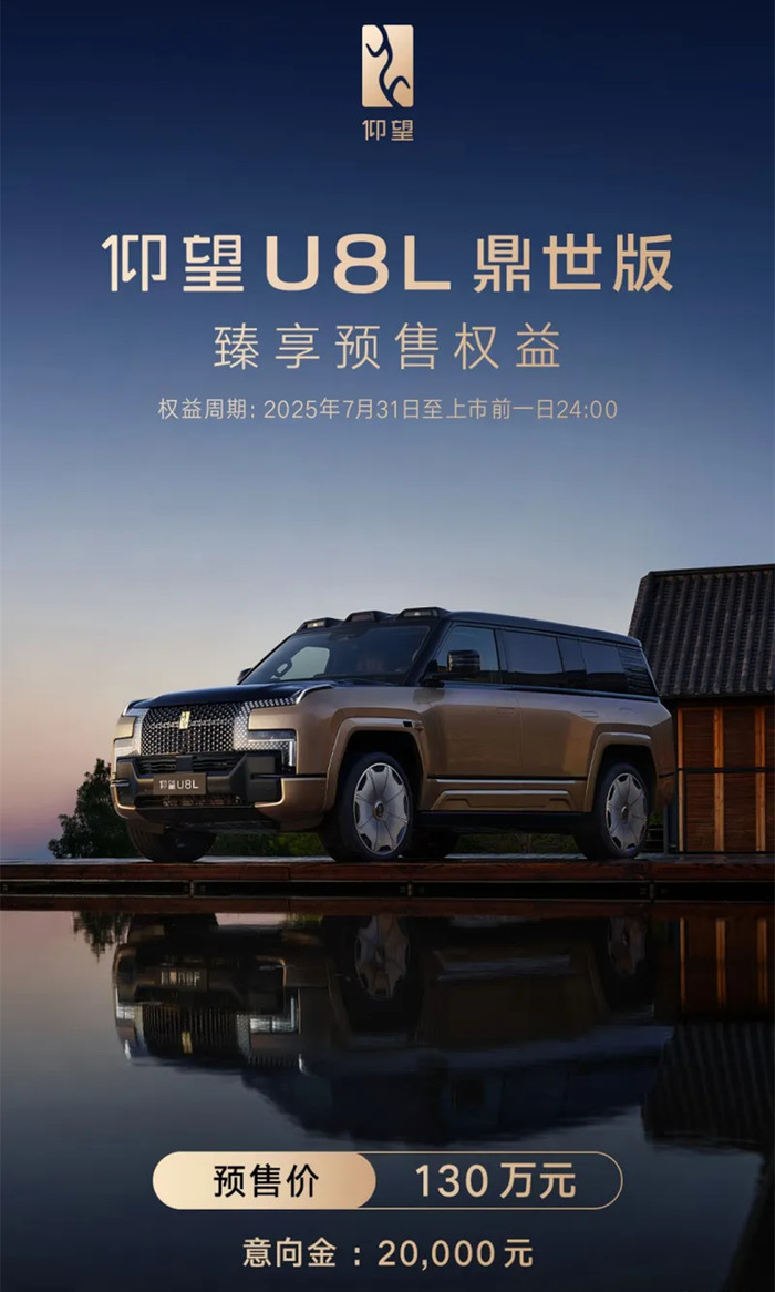 仰望U8L鼎世版开启预售,预售价130万元,意向金2万元。即日起至上市前一天24点,支付意向金用户可享价值3万元选装基金。仰望U8L鼎世版整体设计基本延续在售的仰望U8,相比仰望U8豪华版轴距增加200mm,并采用六座布局,综合续航里程提升至1160km。就问这价格,这品控,这气质,您会和我一起下单吗??