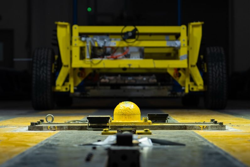 第二项电池安全测试为台车刮底挑战,模拟车辆在行驶中电池遭遇底部刮擦场景,验证底护板抗磨损和形变抑制性能、材料抗形变能力、电芯抗挤压稳定性。测试中,台车以20公里/小时的速度行驶,底部设置直径达150毫米的球形壁障模拟坚硬障碍物,并设定电池包底部侵入量高达30毫米。测试结果显示,电池包外壳仅出现轻微划痕,无泄漏、起火、爆炸现象。