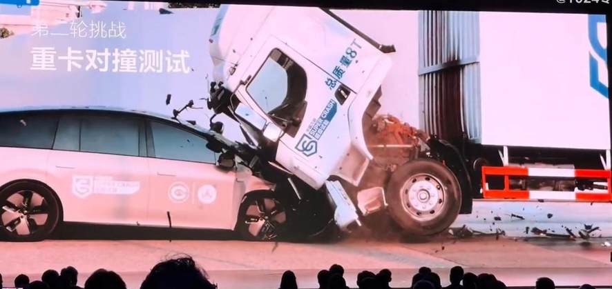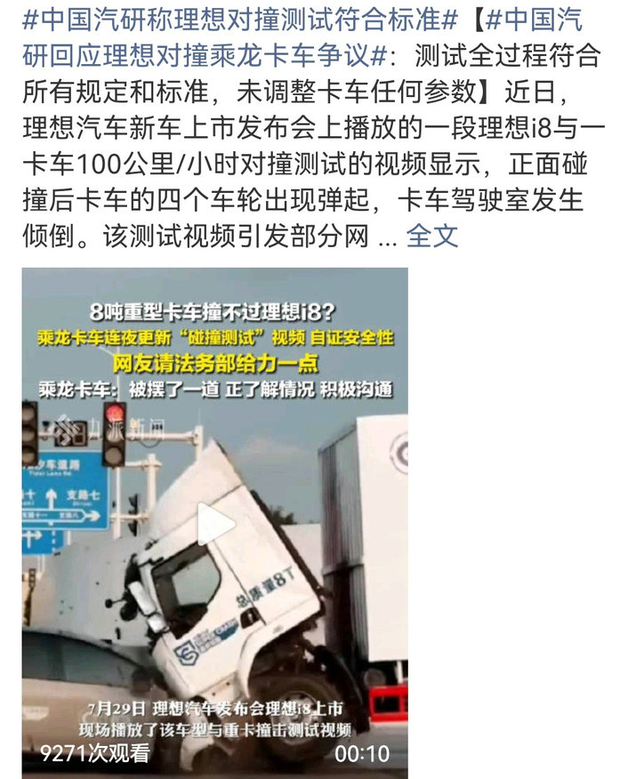 在此前的理想i8发布会上,2吨多的理想i8撞上8吨的乘龙卡车,结果卡车车头被撞到位移,这场面让网友炸开了锅。