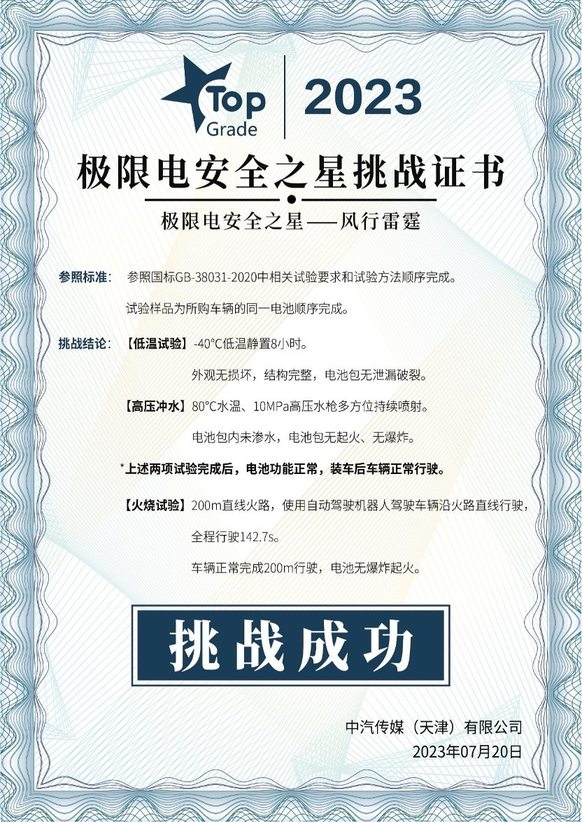 在乘用车领域,东风风行虽略显低调,却有着扎实的行业积淀。其纯电车型全系配备专为安全而研发的铠甲电池,铠甲电池成功通过了一系列炼狱级的极限测试,包括低温试验、高压冲水试验以及千度烈火穿行,并最终获得了中汽中心颁发的“极限电安全之星”荣誉认证。