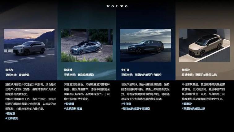 车身提供7种源于自然风光的配色选择:松湖绿、霞光灰、水晶白、牛仔蓝、玛瑙黑、瀚漠沙、薄雾灰,每种色彩都彰显全新XC70与美学的自然融合。